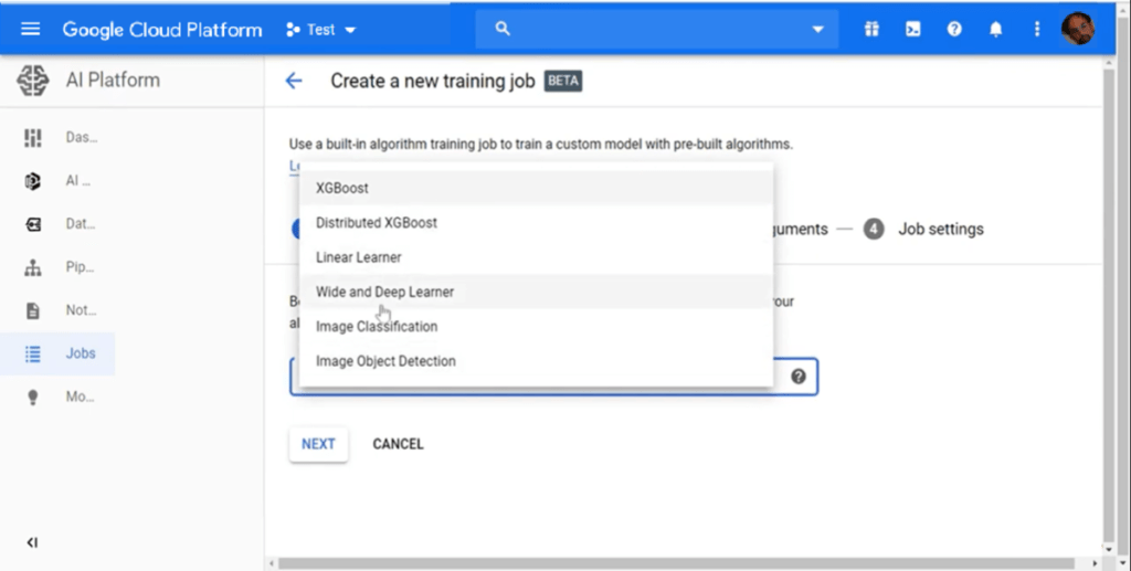 ‘Jobs’ is another interesting feature from the AI platform. Used to train models, you may define these using standard built-in algorithms or your own algorithm, according to your model’s needs. In most cases algorithms built in the platform will suffice for training purposes.