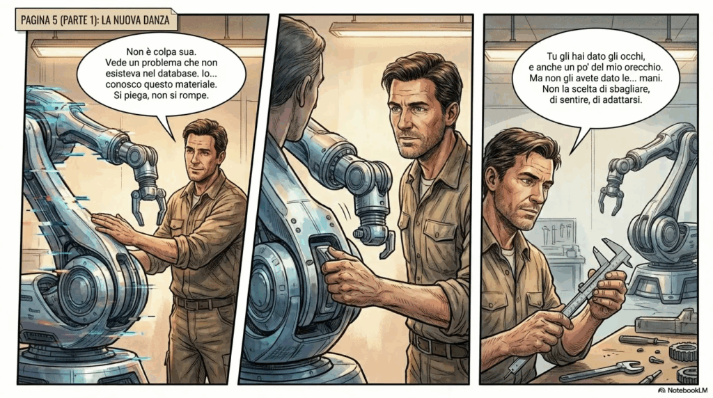 En el primero, pedí: “una breve historia a cómic sobre un obrero reemplazado por un robot guiado por IA, cinco páginas, tono emotivo, temas de conexión y elección.”