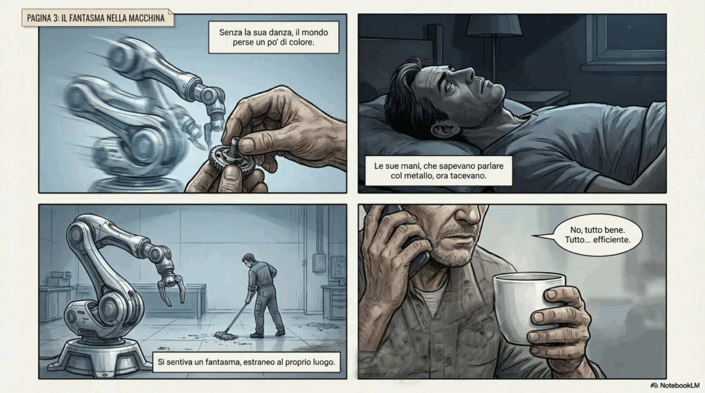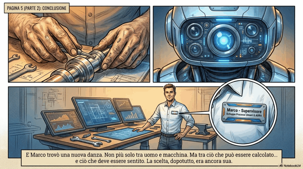 El resultado me sorprendió. No por la perfección técnica, que falta, sino por la coherencia narrativa. Marco observando al robot detenerse frente a materiales defectuosos. Marco interviniendo con sus manos, esas que la máquina no tiene. El final agridulce: “Supervisor de Desarrollo de Procesos Humanos & AURA”. Como en Her de Spike Jonze, donde la intimidad con la IA no elimina lo humano, sino que lo redefine, obligándonos a preguntarnos qué es lo que permanece irreductiblemente nuestro.