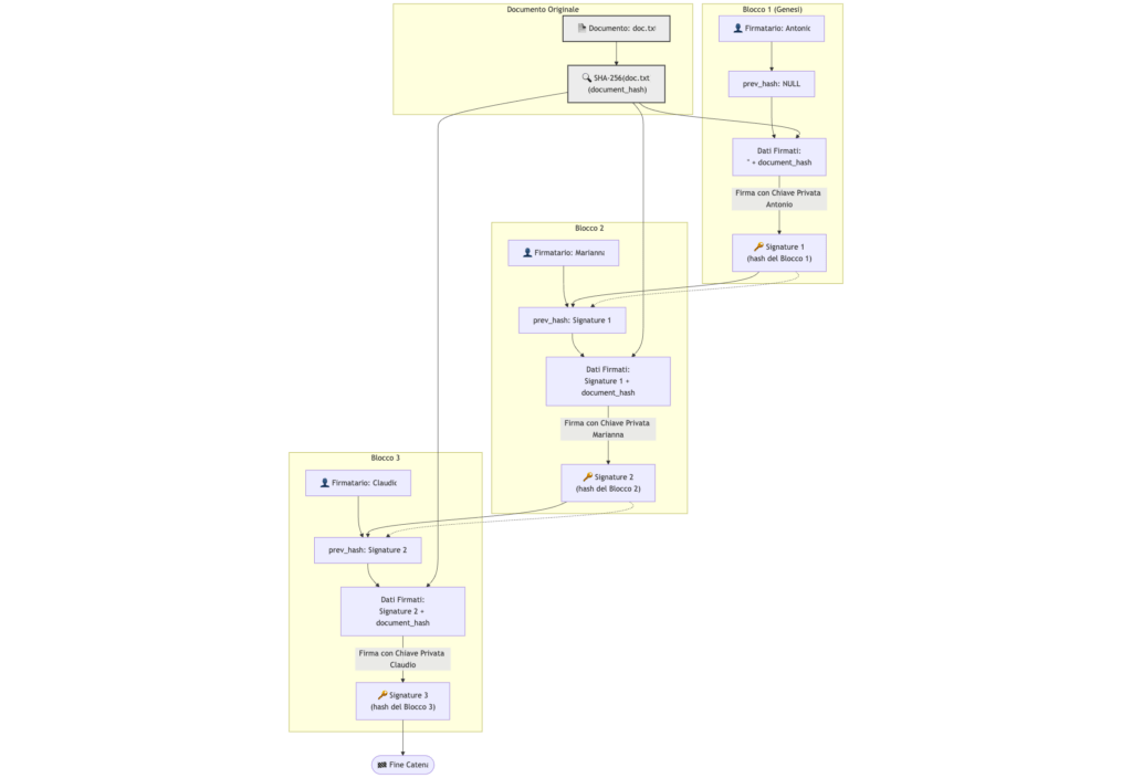 | signature | b8e0d9…f4a1 | Questa firma, calcolata sulla concatenazione della signature di Antonio e l’hash del documento, è unica per questo blocco e sequenza. |